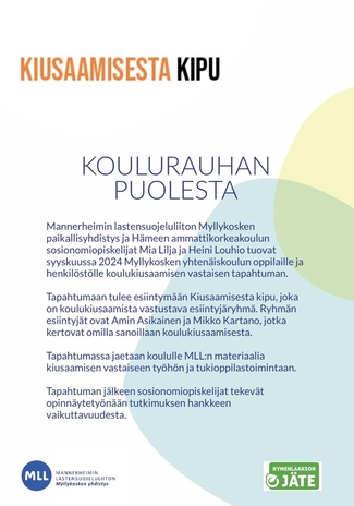 Mannerheimin lastensuojeluliiton Myllykosken paikallisyhdistys ja Hämeen ammattikorkeakoulun sosionomiopiskelijat Mia Lilja ja Heini Louhio tuovat syyskuussa 2024 Myllykosken yhtenäiskoulun oppilaille ja henkilöstölle koulukiusaamisen vastaisen tapahtuman.
